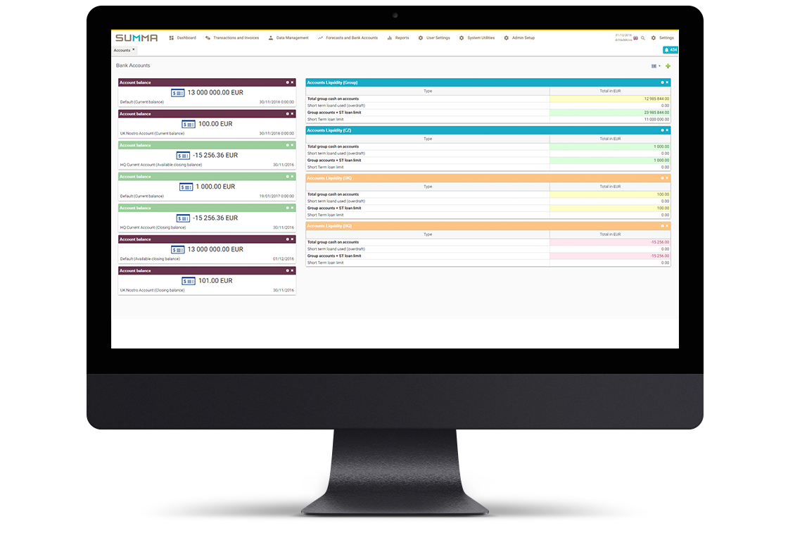 SUMMA CLM provides organizations with a complete overview of all account balances and transactions via automatic feeds of bank account statements. Personalized dashboards enable users to see all the balances of the organization at any given time with adjustable structural views for portfolios or currencies.