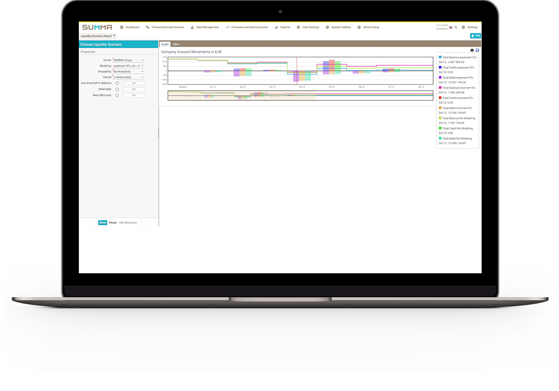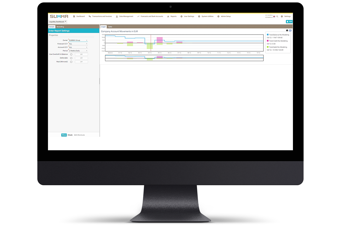 SUMMA CLM module provides instant visibility of current and forecasted liquidity, bank accounts status, and multi-currency exposures of portfolios. It has easy to use reports and tools for liquidity modelling and identifying its sensitivities and key drivers. This enables optimisation of funding, more efficient cash-balances management and reduction in operating and financial costs. Proactive liquidity risk management is carried out while delivering on compliance requirements.