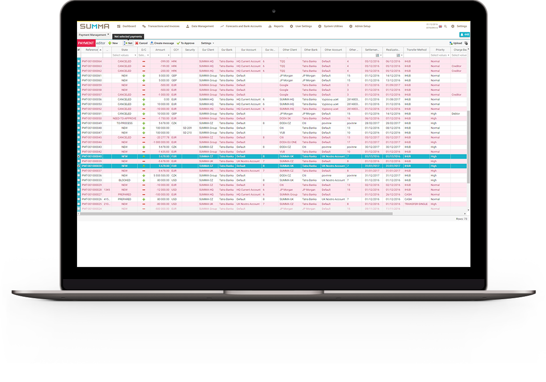 Flexible platform for centralized payment management for the whole organization. SUMMA CLM enables to work with multiple accounts for a counterparty and execute netting of transactions.